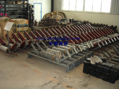 它主要由主梁、槽形梁、可調(diào)支座、旋轉(zhuǎn)機構(gòu)、錐形輥子和平形輥子等組成。使用時,由于錐形輥子兩端的直徑不同,旋轉(zhuǎn)時,其表面的線速度沿軸向各不相同,因此與輸送帶產(chǎn)生一定的摩擦力,當(dāng)輸送帶跑偏時,輸送帶偏向一側(cè)的錐形輥與輸送帶之間的摩擦力就大于偏離一側(cè)錐形輥與輸送帶之間的摩擦力,二者之差,產(chǎn)生一個促使槽形梁繞旋轉(zhuǎn)機構(gòu)中心線旋轉(zhuǎn)的力矩,從而使槽形梁相對主梁擺動,使輸送帶復(fù)位。